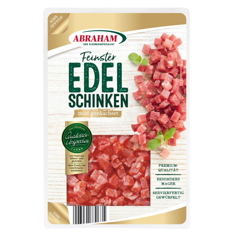Aus besonders mageren Teilstücken geschnitten, sind unsere Edelschinkenwürfel neben ihrer Verwendung auf Brot die ideale Zutat für viele Gerichte der bewussten Küche. Schonend geräuchert und sehr zart im Biss eine wahre Gaumenfreude. Verpackt in der 2x100-g-Packung zudem sehr einfach zu portionieren.