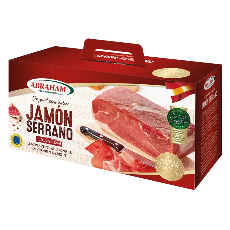 Er ist ideal für besondere Anlässe, laue Sommerabende und verleiht jedem Anlass mediterranen Flair. Mit dem Messer und dem Brett, können Sie den Serrano Schinken sofort aufschneiden und in hauchdünne Scheiben schneiden. Auch als platzsparende, wiederverschließbare 80-g-Faltpackung oder Servierschnittpackung erhältlich.