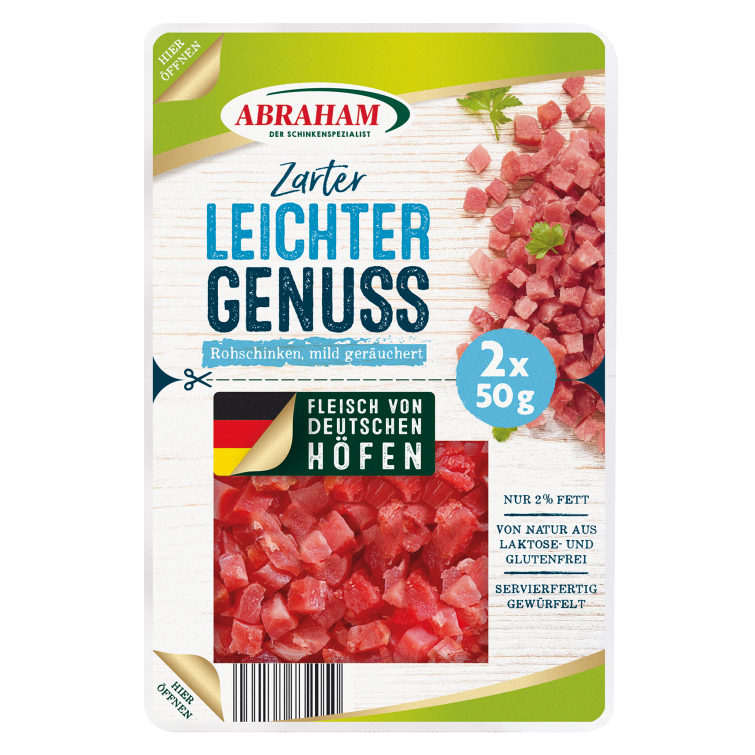 Aus besonders mageren Teilstücken geschnitten und mild geräuchert, kombinieren diese Würfel das sanfte Aroma des Leichtschinkens. Unsere Leichtschinkenwürfel mit Fleisch von niedersächsischen Höfen gemäß der Haltungsform "Stall + Platz" sind neben Ihrer Verwendung auf Brot die ideale Zutat für viele Gerichte der bewussten Küche. Voller Geschmack mit nur 2 % Fett!