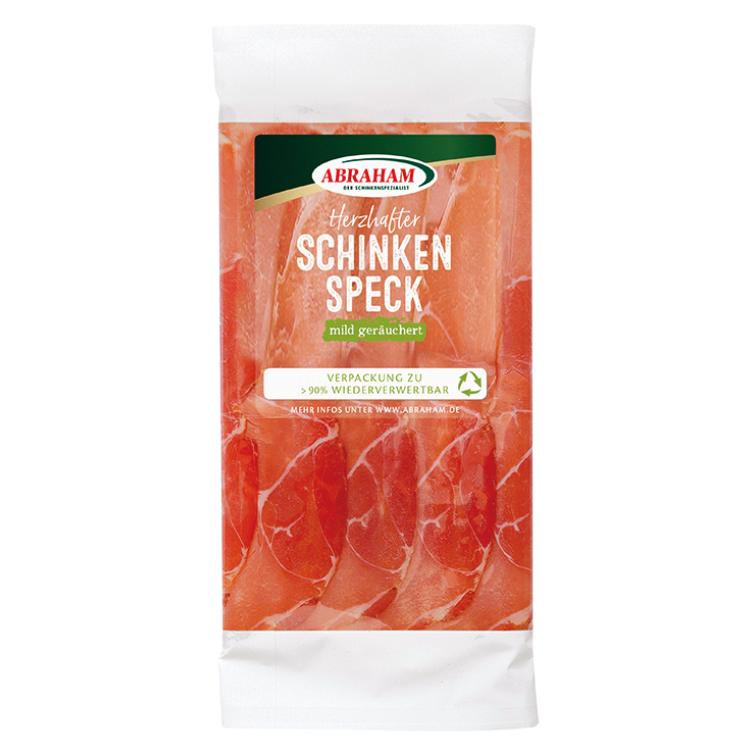 Unser Schinkenspeck wird aus dem Hüftstück des Schinkens geschnitten, mild gesalzen und schonend über Buchenholz geräuchert. Mit typischer Fettmaserung, rustikal im Charakter und deftig würzig im Geschmack.