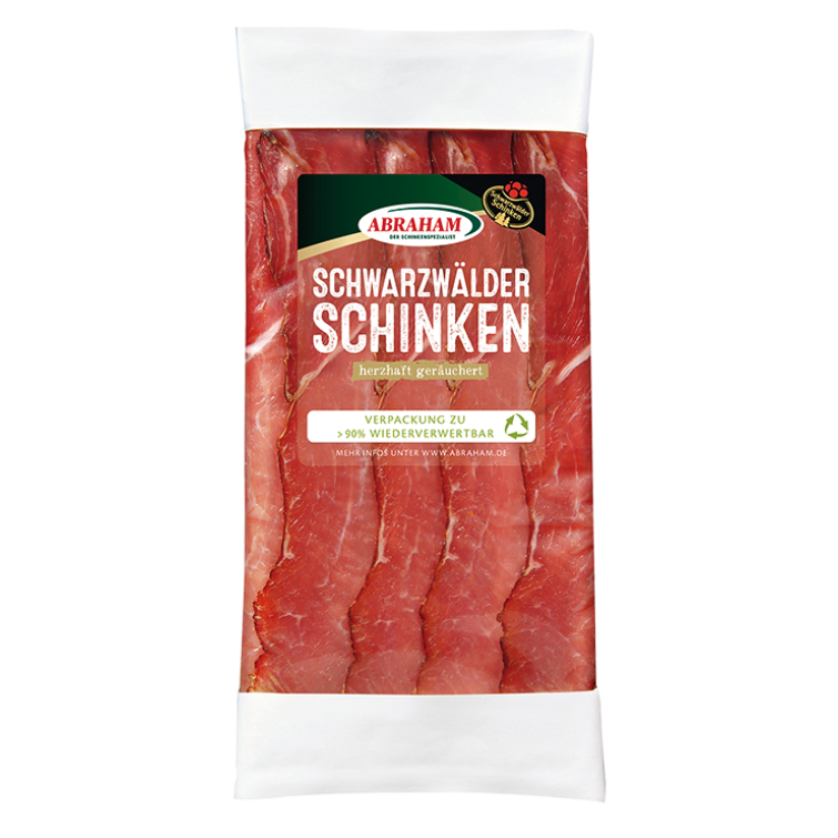 Die berühmte süddeutsche Rohschinkenspezialität! Unser Traditionsschinken stammt aus dem kleinen, im Mittel-Schwarzwald gelegenen Ort Schiltach und ist damit ein regionaltypisches Original. Über heimischen Tannenhölzern kaltgeräuchert und vollendet gereift, entwickelt er dort seinen herzhaft würzigen, von der typischen Rauchnote geprägten Geschmack. Schwarzwälder Schinken von Abraham ist mit dem EU-Siegel der „geschützten geographischen Angabe“ versehen, wodurch er strengen Produktionsvorgaben unterliegt, die die regionaltypische Art seiner Herstellung sichern.