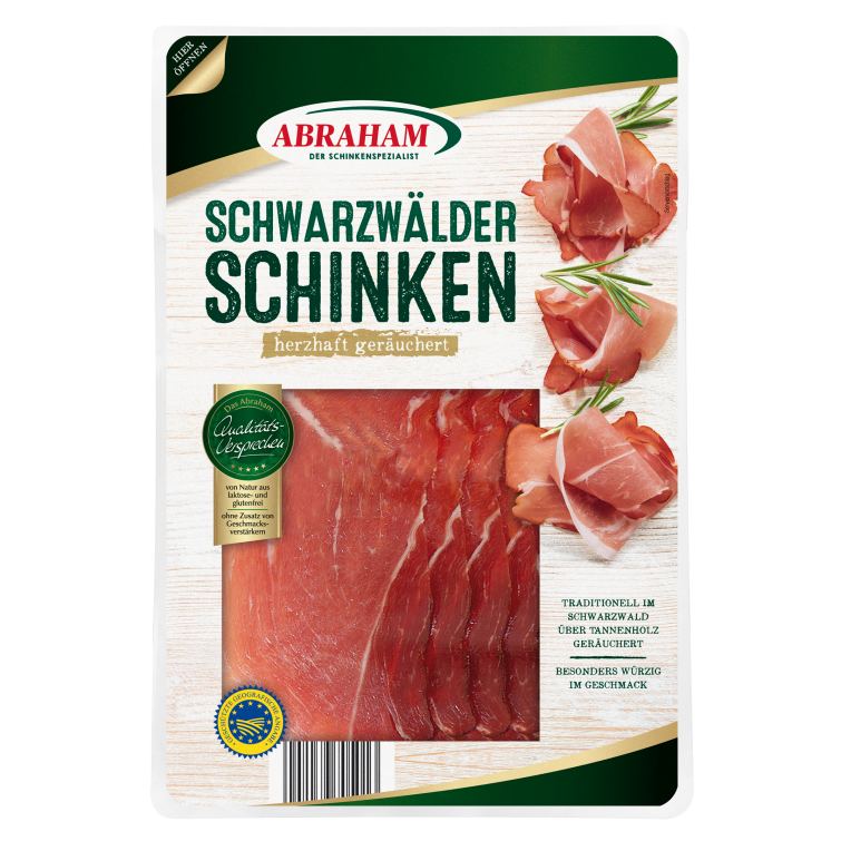 Die berühmte süddeutsche Rohschinkenspezialität! Unser Traditionsschinken stammt aus dem kleinen, im Mittel-Schwarzwald gelegenen Ort Schiltach und ist damit ein regionaltypisches Original. Über heimischen Tannenhölzern kaltgeräuchert und vollendet gereift, entwickelt er dort seinen herzhaft würzigen, von der typischen Rauchnote geprägten Geschmack. Schwarzwälder Schinken von Abraham ist mit dem EU-Siegel der „geschützten geographischen Angabe“ versehen, wodurch er strengen Produktionsvorgaben unterliegt, die die regionaltypische Art seiner Herstellung sichern. Auch als praktische, wiederverschließbare 80-g-Faltpackung erhältlich.