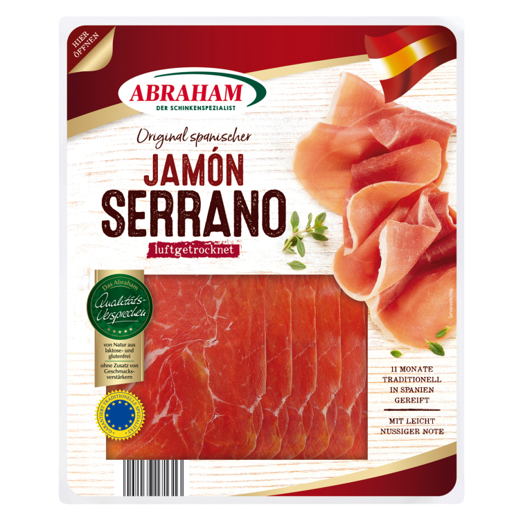 „Aus der Sierra“ – dies ist die Bedeutung, die sich hinter dem spanischen Wort Serrano verbirgt. Es beschreibt den hochgelegenen Herkunftsort dieser luftgetrockneten, mindestens 11 Monate gereiften Spezialität, dem sie sowohl den Namen als auch ihren mild aromatischen, von einer typisch nussigen Note geprägten Geschmack verdankt. Original spanischer Serrano von Abraham ist mit dem EU-Siegel der „geschützten traditionellen Spezialität“ versehen, wodurch er strengen Produktionsvorgaben unterliegt, die die Ursprünglichkeit seiner Herstellung sichern. Auch als platzsparende, wiederverschließbare 80-g-Faltpackung erhältlich.