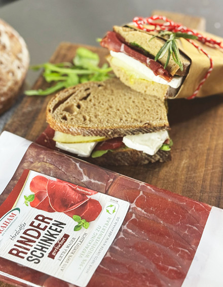 Den groben Senf mit Honig verrühren, auf zwei Brotscheiben verstreichen. Darauf den Rucola, Birnenscheiben, Rinderschinken und Ziegenkäse schichten. Mit den übrigen Brotscheiben abdecken und leicht andrücken.