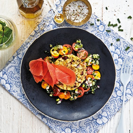 Auberginen-Tatar mit Tomatensalat und Serrano Minis
