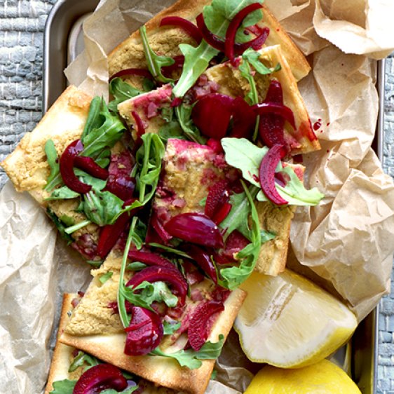 Flammkuchen mit lauwarmen Hummus, eingelegten Rote Bete Zwiebeln, Rucola und Schinkenwürfeln