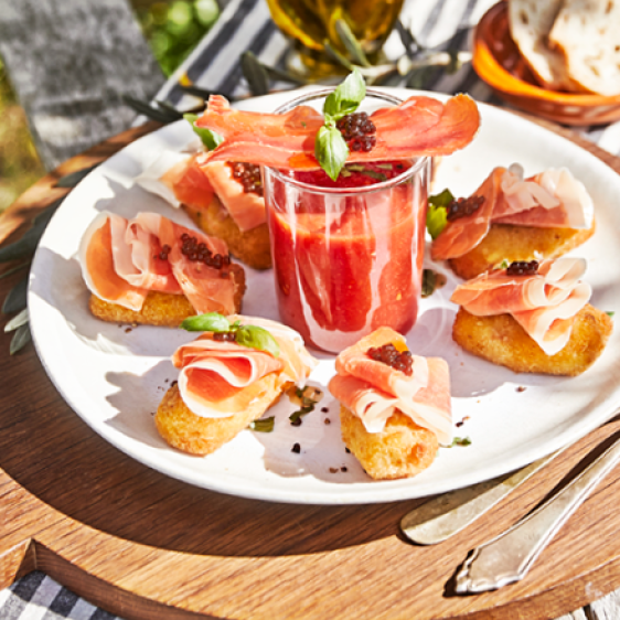 Gazpacho in Gläser füllen, mit Schinkenchips und Mini-Croquetas getoppt mit Serrano servieren.