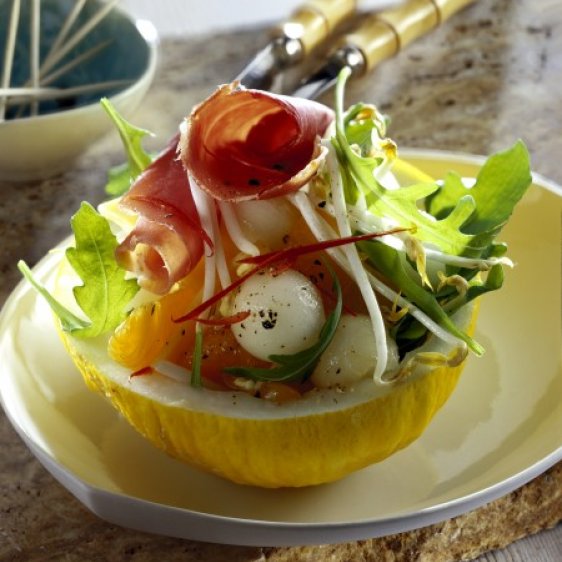 Den Salat in die leeren Melonenhälften füllen. Schinken in Streifen schneiden, zu kleinen Röllchen oder Tütchen formen und dekorativ auf dem Salat anrichten. Sofort servieren.