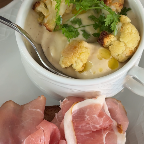 Geröstete Blumenkohlcremesuppe mit Katenschinken