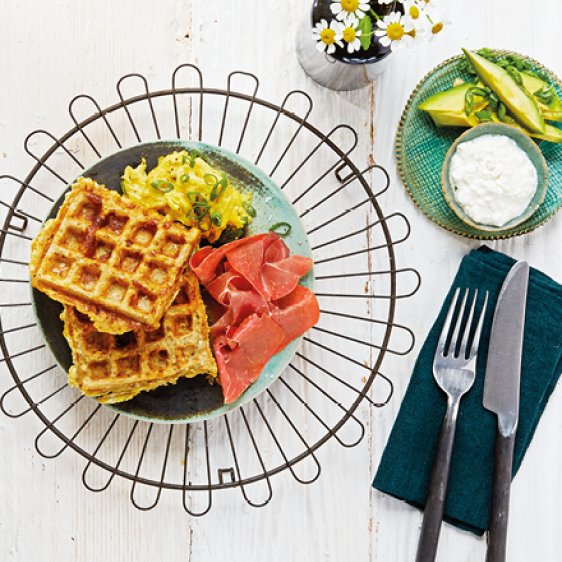 Die Waffeln mit Serrano-Schinken, frischem Rührei und Avocado servieren.