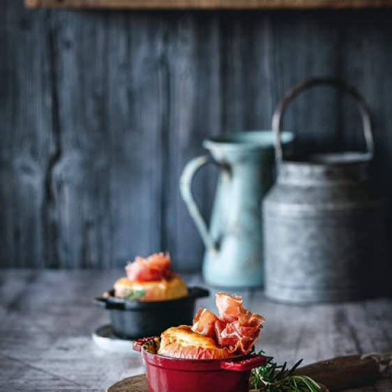 Die fertig gebackenen Äpfel auf Tellern anrichten und mit je einer Scheibe Serrano Gran Reserva servieren. Am besten heiß genießen.