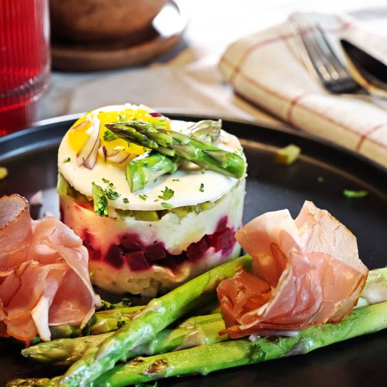 Zuerst das Püree in den Tortenring füllen, dann die Rote Bete, erneut Püree und anschließend die Gürkchen und zum Schluss mit dem Ei toppen. Nun den Tortenring entfernen, die Spargelstücke auf die „Torte“ und den restlichen Spargel daneben drapieren. Alles mit den Zwiebeln und Dill bestreuen und zum Schluss mit 2-3 Katenschinken-Röschen anrichten.