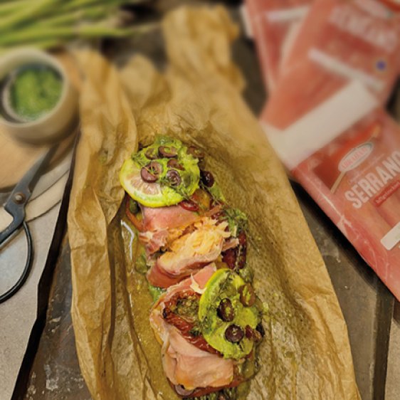 Serrano überlappend auf einem Brett auslegen, Lachs mittig auflegen, beide Seiten einklappen.