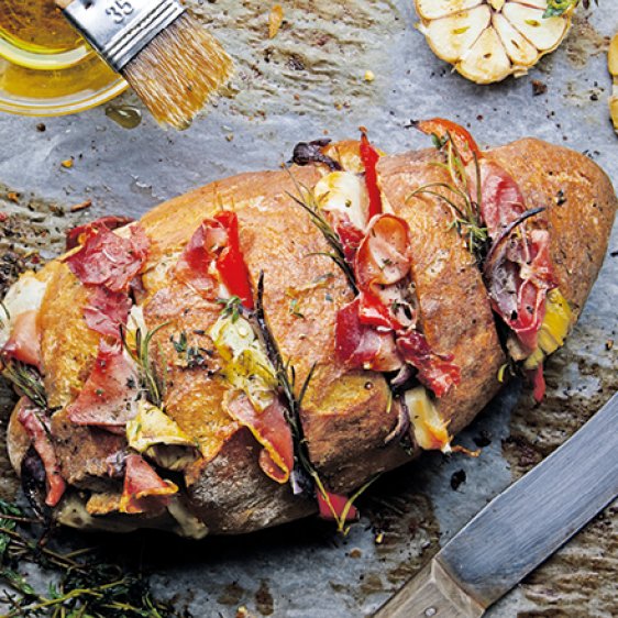 Mediterran gefülltes Landbrot mit Serrano Schinken