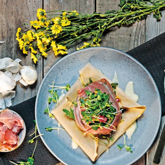 Je eine Galette auf einem Teller anrichten und mit etwas Salat sowie einigen Scheiben Katenschinken belegen. Zum Abschluss mit Aioli beträufeln und mit frischer Kresse bestreuen. Sofort servieren.
