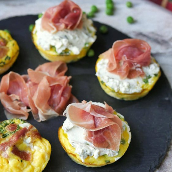 In 3 Muffinförmchen jeweils 1–2 TL Erbsen füllen. In die anderen 3 Muffinförmchen jeweils 2 Scheiben Serrano Minis legen.