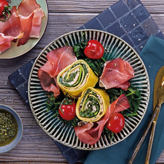 Nudelroulade mit Blattspinat, glasierten Kirschtomaten, Kräuterpesto und Schwarzwälder Schinken