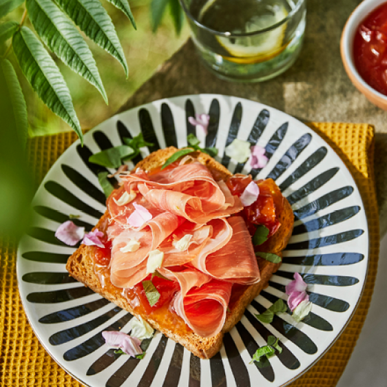 Basilikum fein zupfen und auflegen, anschließend mit Serrano Reserva hauchfein toppen.