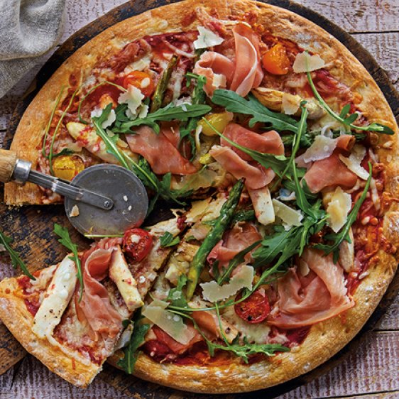 Pizza mit Spargel, Rucola, Parmesan und Katenschinken