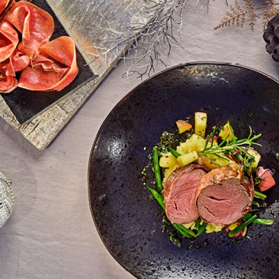 Rinderfiletmedaillons im Serranomantel mit Apfel-Bohnen und Kartoffelstampf