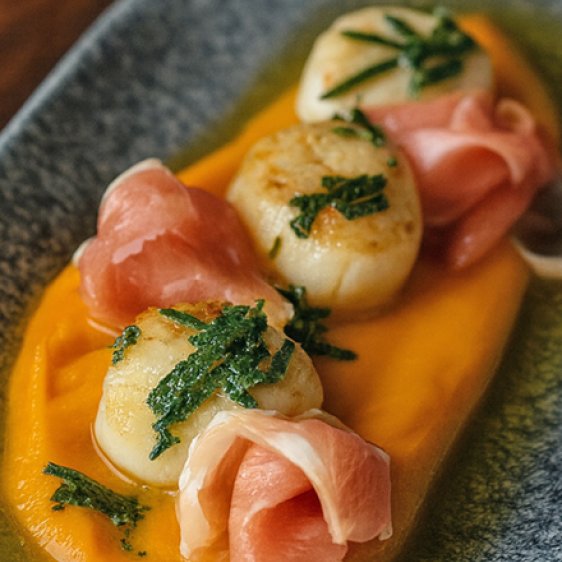 Sansibar-Rezept: Jakobsmuscheln mit Kürbispüree und Bauernschinken