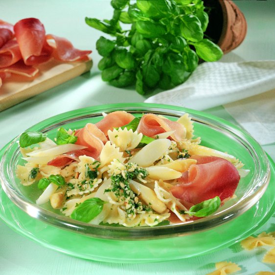 Pesto unter die noch warmen Nudeln rühren, Spargel untermischen. Schinken halbieren und locker darauf verteilen. Fertig!