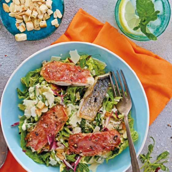 Serrano-Dorade mit Caesar Salad und Mandeln