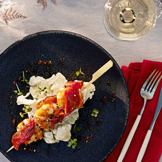Serrano-Garnelen-Spieße mit Aioli-Blumenkohl und Kresse