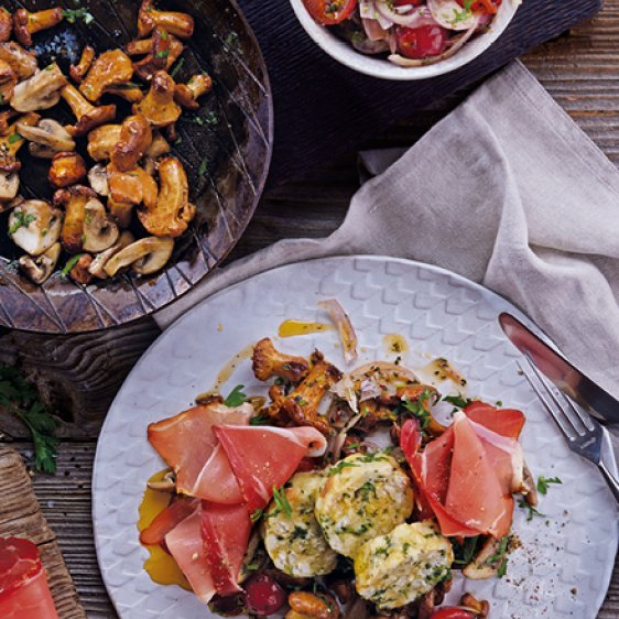 Serviettenknödel mit Pilz-Kirschtomaten-Ragout und Schwarzwälder Schinken