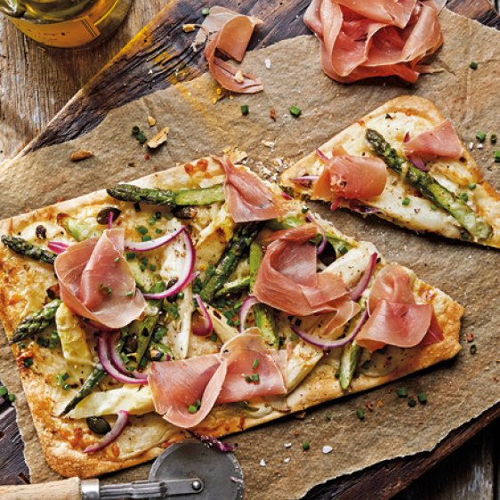 Teig halbieren, eine Hälfte auf bemehlter Fläche dünn ausrollen (ca. 30x20 cm), auf Backblech legen. Mit Crème bestreichen, Käse, Zwiebelstreifen und Spargelstücke darauf verteilen.