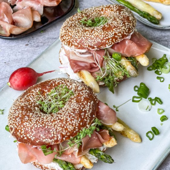 Spargel-Katenschinken-Bagel mit Frischkäsecreme