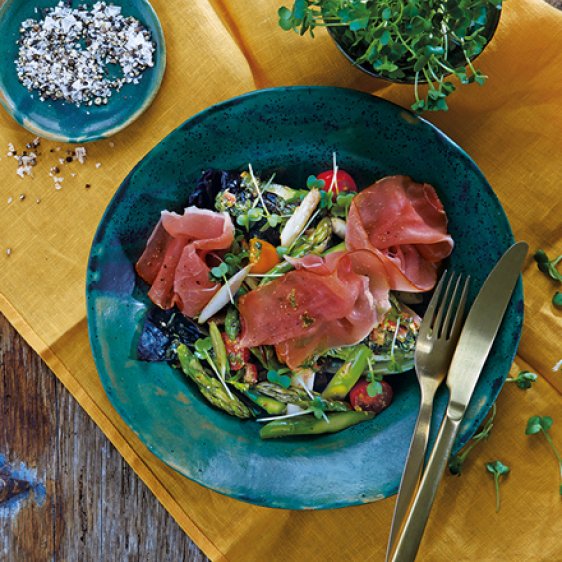 Spargelsalat mit Kirschtomaten, Kräuter-Öl und Katenschinken