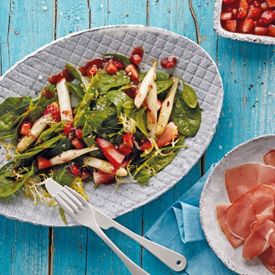 Spinatsalat mit Spargel, Erdbeeren und Katenschinken