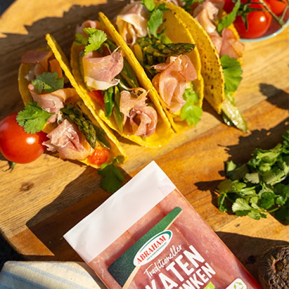 Tacos mit grünem Spargel, Katenschinken und Limetten-Joghurtsauce