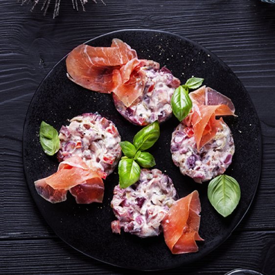 Das Tatar portionsweise in kleine Anrichtringe drücken und auf Teller setzen. Mit fein geschnittenem Serrano-Schinken garnieren und sofort servieren.