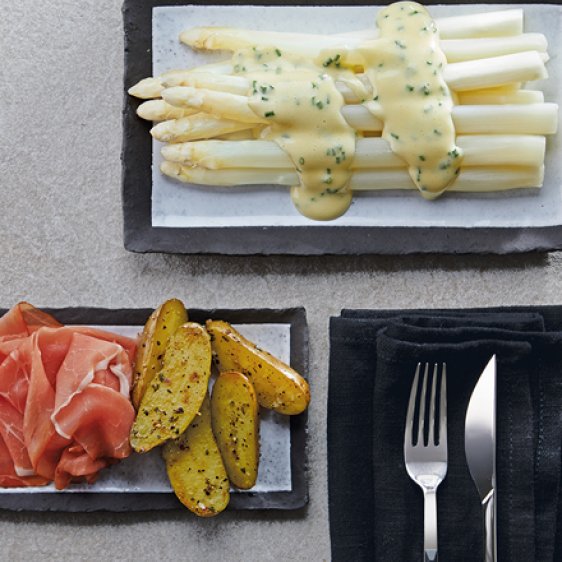 Weißer Spargel, Schnittlauch-Hollandaise, Kartoffelhälften und Katenschinken